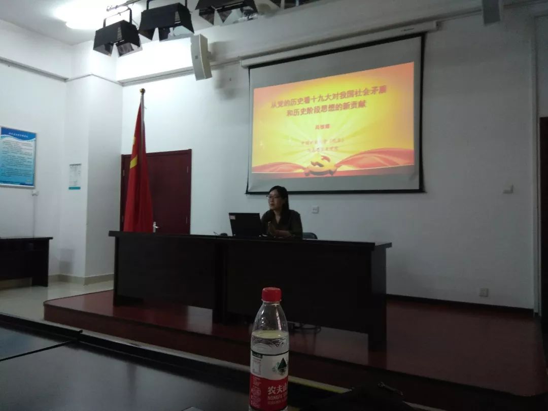 政治学党支部和十八中行政党支部两个共建支部对本次活动都非常重视,周密组织。政治学党支部书记郭浩,纪检委员武军秀,组织委员、宣传委员肖维娜等党员代表,以及十八中行政党支部全体党员参加了此次活动,十八中行政党支部丁长林书记主持此次党课学习。政治学党支部组织委员、宣传委员肖维娜讲授了“从党的历史看十九大对我国社会主要矛盾和历史阶段思想的新贡献”的主题党课。她在党课中回顾党的历史,回顾不同时期我国社会的主要矛盾,并分析新时代判断我国社会主要矛盾发生转变的依据,同时也强调我国所处历史阶段中“两个没有变”的基本国情。课后,十八中行政党支部的教师党员们积极分享了自己此次党课学习的心得,在场成员们展开了热烈的讨论。